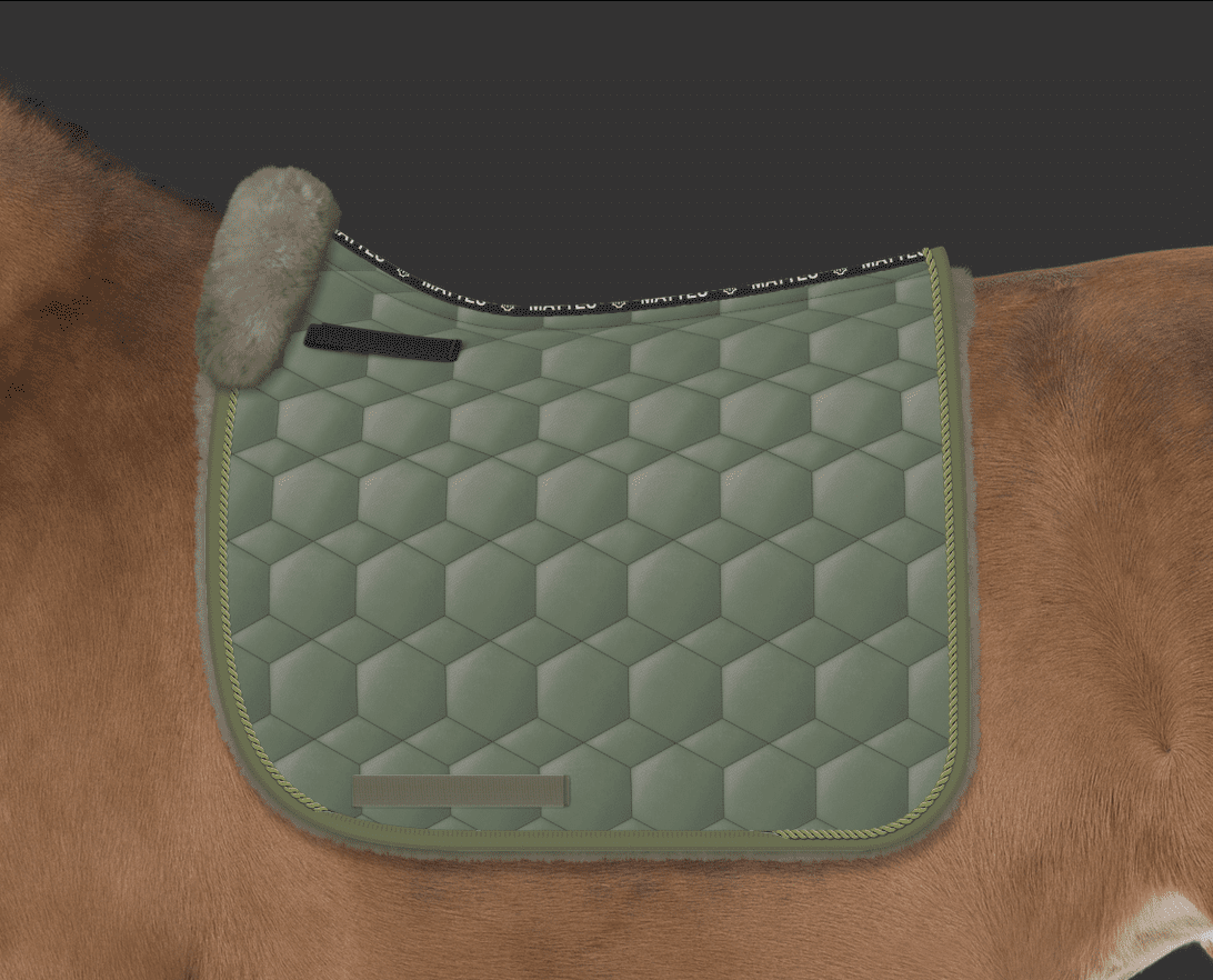 Mattes underlaget her er med lam i front, lam under, og på hele underkanten rundt løber der en 8 cm bred lammekant. Dette er for at undgå slid i pelsen, ømhed i huden, som i ekstreme tilfælde kan nedsætte hestens arbejde i kroppen og henover overlinjen.